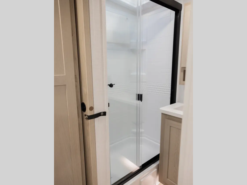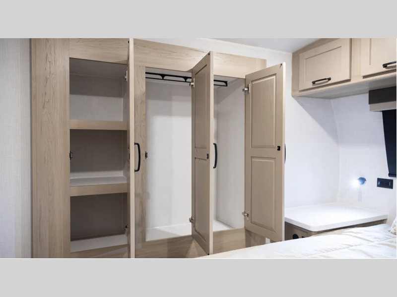 Each model is constructed with a fully laminated walkable roof, 6-sided full-aluminum frame, and a fiberglass front cap with Clear Coat for added protection. You will appreciate the slam baggage doors and 200W solar panel outside, plus there is a Climate Protection Package for better insulation. Inside, you'll love the solid surface countertops, roller shades, and soft close roller bearing drawers.