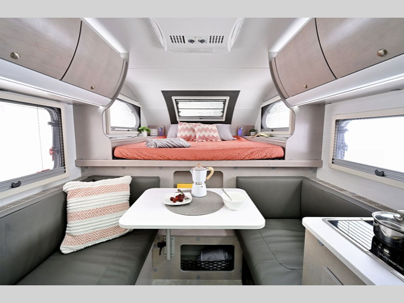 The Cirrus is a four-season camper that comes with an Alde heat/hot water system and electric jacks with a remote. The solar roof package will keep you powered, and you're sure to always enjoy a great night's rest on the comfortable sleeping spaces.
