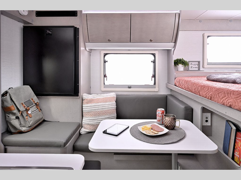 Sleeps 3 Length 12 ft 8 in Ext Width 8 ft 2 in Ext Height 8 ft 2 in Int Height 6 ft 4 in Exterior Color Bright White, Steel Gray, Jet Black, Burgundy Dry Weight 1565 lbs Fresh Water Capacity 18 gals Grey Water Capacity 13 gals Black Water Capacity 5 gals Available Beds RV Queen Refrigerator Type 12V Compressor Refrigerator Size 4.6 cu ft Cooktop Burners 2 Center of Gravity Front 24.75 in Water Heater Type Alde Truck Bed Size Short/Long Body Style Hard-Side -