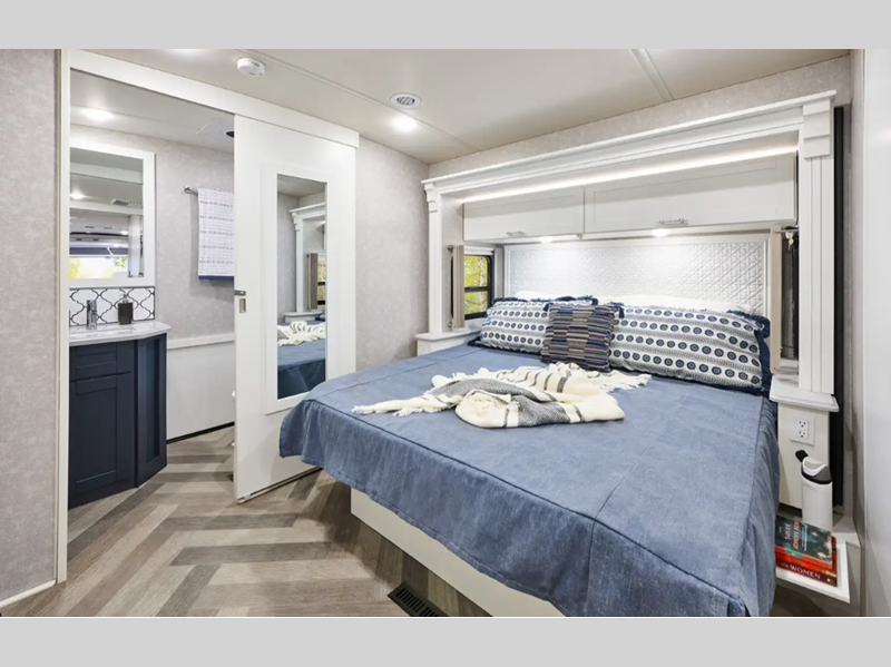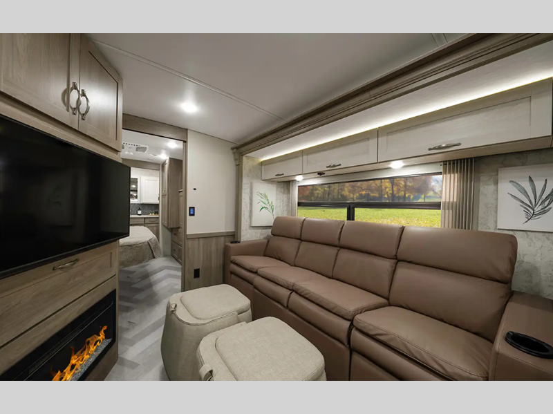 Sleeps 5 Slides 2 Length 35 ft 6 in Ext Width 8 ft 6 in Ext Height 12 ft 1 in Int Height 6 ft 10 in Interior Color Organic Comfort Dark, Organic Comfort Light, Bohemian Oasis Exterior Color Full-Body Paint; Silvermist, Wedgewood ll, Steel Grey, Night Sky Hitch Weight 5000 lbs GVWR 22000 lbs Fresh Water Capacity 75 gals Grey Water Capacity 57 gals Black Water Capacity 48 gals Tire Size 22.5" Furnace BTU 40000 btu Generator 5,500-Watt Cummins Onan Marquis Gold Fuel Type Gas Engine 7.3L V8 Chassis Ford F-53 Fuel Capacity 80 gals Wheelbase 228 in Available Beds King Refrigerator Type Stainless Steel Residential with Ice Maker and Water Dispenser Convection Cooking Yes Cooktop Burners 2 Shower Size 34" x 34" Number of Awnings 1 Axle Weight Front 8000 lbs Axle Weight Rear 15000 lbs LP Tank Capacity 76.14 lbs Water Heater Capacity 10 gal Water Heater Type 110V/LP AC BTU 28500 btu Basement Storage 122 cu. ft. TV Info LR 50" HDTV, BR 32" HDTV, Ext. 32" HDTV Awning Info 19' Power w/LED Lighting Washer/Dryer Available Yes Gross Combined Weight 26000 lbs Shower Type Radius Electrical Service 50 amp Similar Floorplans