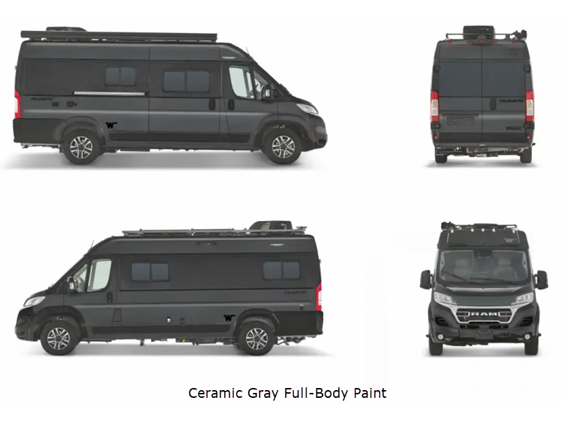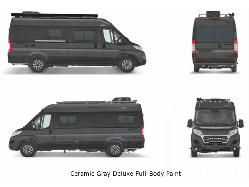 Sleeps 2 Length 21 ft Ext Width 6 ft 9 in Ext Height 9 ft 4 in Int Height 6 ft 3 in Interior Color Canyon with Soft Oak, Cashmere with Weathered Teak II Exterior Color Full Body Paint, Deluxe Full Body Paint Choices; Bright White, Bright Silver, Ceramic Gray, Sandstone Hitch Weight 3500 lbs GVWR 9350 lbs Fresh Water Capacity 18 gals Grey Water Capacity 14 gals Black Water Capacity 11 gals Generator 2,800W Gas Fuel Type Gasoline Engine 3.6L V6 Chassis Ram ProMaster Horsepower 280 hp Fuel Capacity 24 gals Wheelbase 159 in Available Beds Double Refrigerator Type Two Door Compressor Driven Refrigerator/Freezer 12V Refrigerator Size 6 cu ft Cooktop Burners 2 Shower Size 28" x 51" Number of Awnings 1 Axle Weight Front 4629 lbs Axle Weight Rear 5291 lbs LP Tank Capacity 25 lbs Water Heater Capacity 2.6 gal Water Heater Type Truma Combi G Comfort Plus TV Info Coach 24" HDTV Awning Info 13' Rack Mounted Power with LED Lighting and Bluetooth Control Gross Combined Weight 12000 lbs Shower Type Wet/Bath Shower Electrical Service 30 amp  -