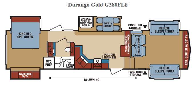 The Durango Gold G380FLF fifth wheel by KZ features a front living area and five slides which really helps to open up the floor space and give a home feel throughout the fifth wheel.