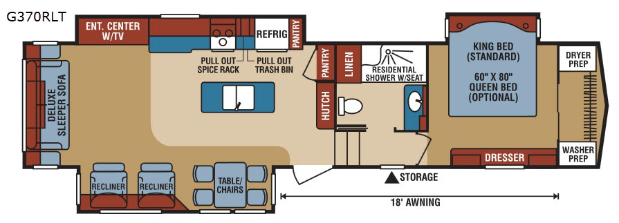 As you enter into the front bedroom you will see a nice size dresser. Across from the dresser there is a slide with a king bed or you can choose an optional queen bed. Along the front wall of the room there is a wardrobe which has an optional washer/and dryer prepped space.